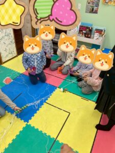ハロウィンパーティーの最後を締めくくるの【おかしハンター(お菓子千本釣り)】です!どれか一本好きな紐を選んで引っ張るとお菓子の入った袋がもらえます!どの紐がどのおかしの袋に繋がっているかはわかりません!子どもたちも自分の好きな紐を引っ張ってお菓子を獲得できました。