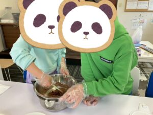 ・材料をつかむ、混ぜる、こねる、切る、ちぎる、つぶす、注ぐなどによって微細運動のトレーニング