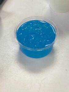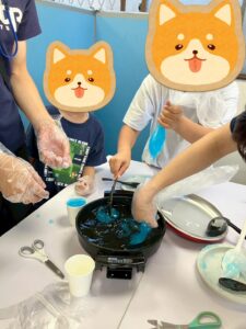片栗粉、水、砂糖、ブルーハワイ(かき氷シロップ)を混ぜてホットプレートや鍋で加熱します。加熱はスタッフが行い、子どもたちは材料や加熱前に回数を決めて混ぜていました。加熱すると、水色から透き通る青色に変化しました。水っぽかったのがどろりと固まってきました。変化が始まってからはあっという間でしたね。