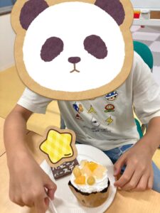 みんなでお祝いの歌を歌いました。ホイップやチョコレート、フルーツがトッピングされたカップケーキを食べました。